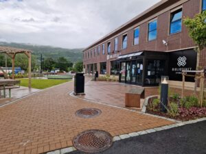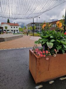 Eit triveleg uteområde med scene og plass for små og store møte.