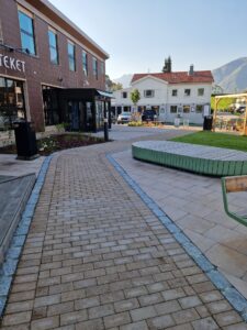 Parken er universelt utforma med vakker belegningsstein, benkar, frukttre og grøne plantar – ein levande møteplass midt i sentrum